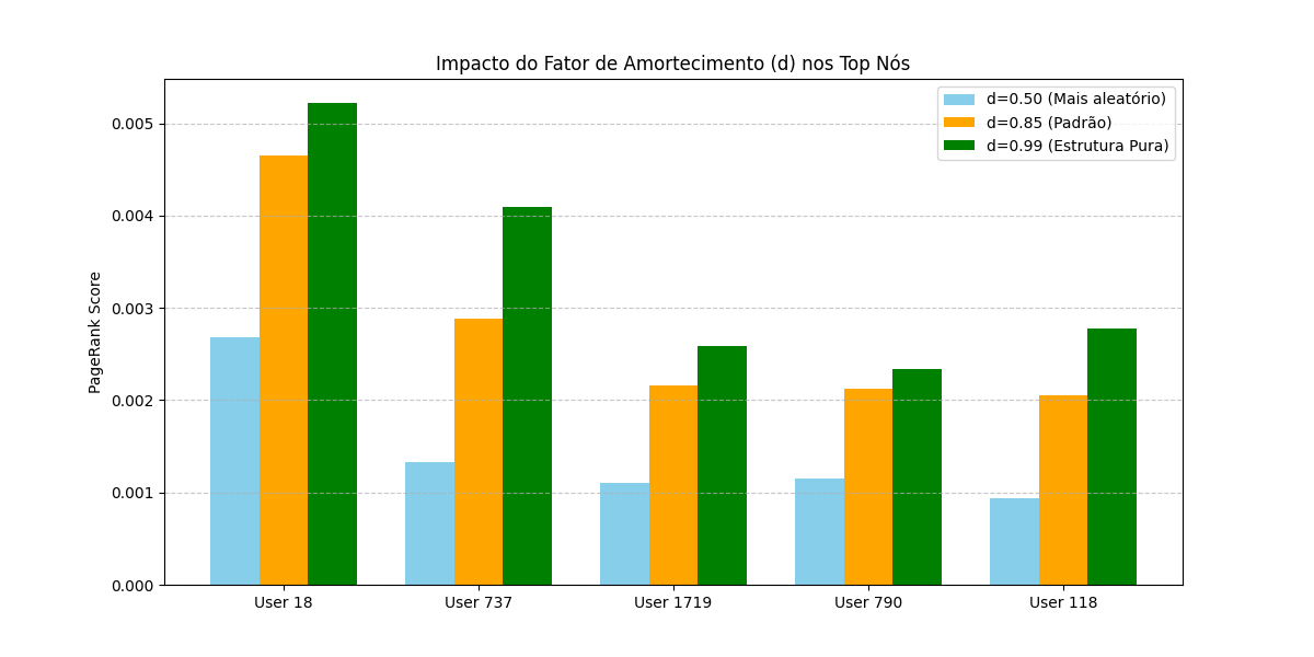 - d = 0.50 (Mais Aleatório): A pontuação de PageRank é distribuída de forma mais uniforme. As diferenças entre os nós de topo e os nós comuns diminuem, pois o algoritmo passa mais tempo "pulando" para páginas aleatórias.